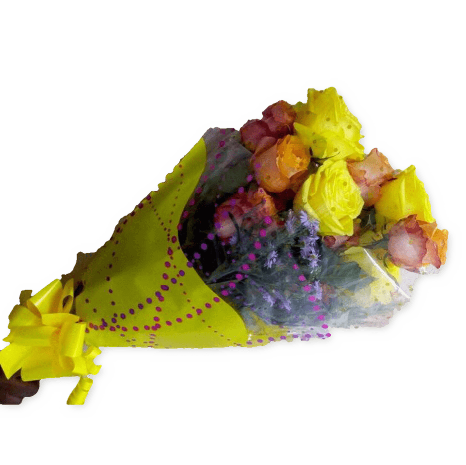 12 Stunning mixed roses in bouquet sleeve. Gift wrapped with bow and message card