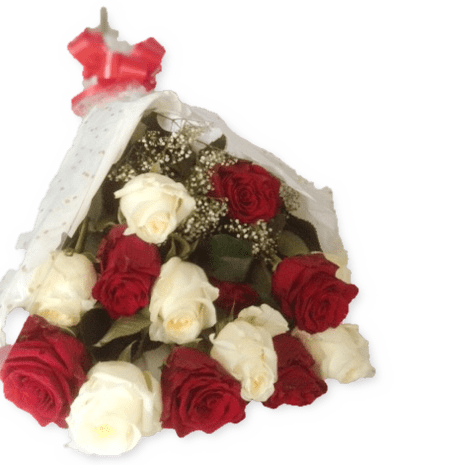 6 Red and 6 White Roses mixed with gypsophilia Gift Wrapped with Bouquet Sleeve and Gift Card
