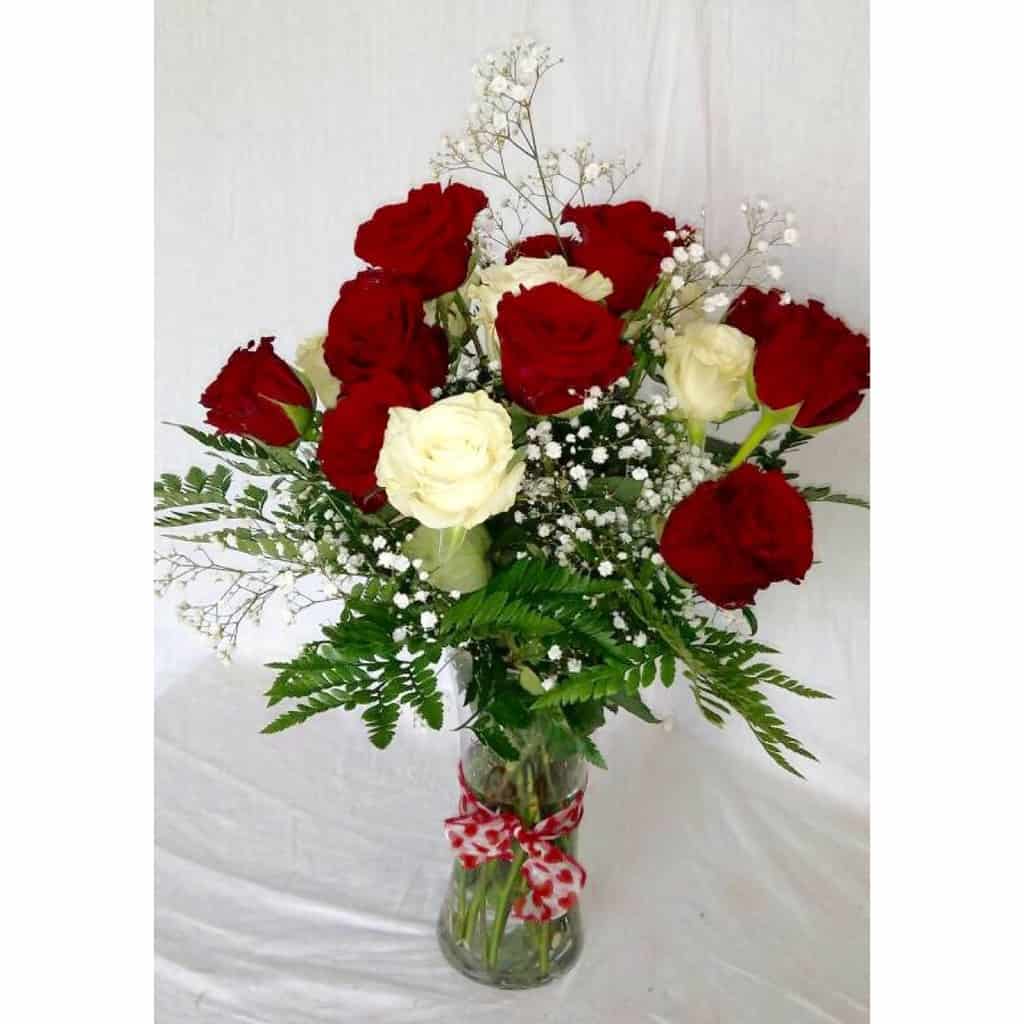 This Radiant Bouquet of mixed roses with bold beauty and unforgettable color reflects the shining personality and charm of the recipient. Rich red and white roses, luxurious leather leaf ferns and brilliant white baby’s breath are artfully presented in a beautiful clear vase. Finished off with a lovely ribbon, this arrangement will make an incredible gift they won’t soon forget.