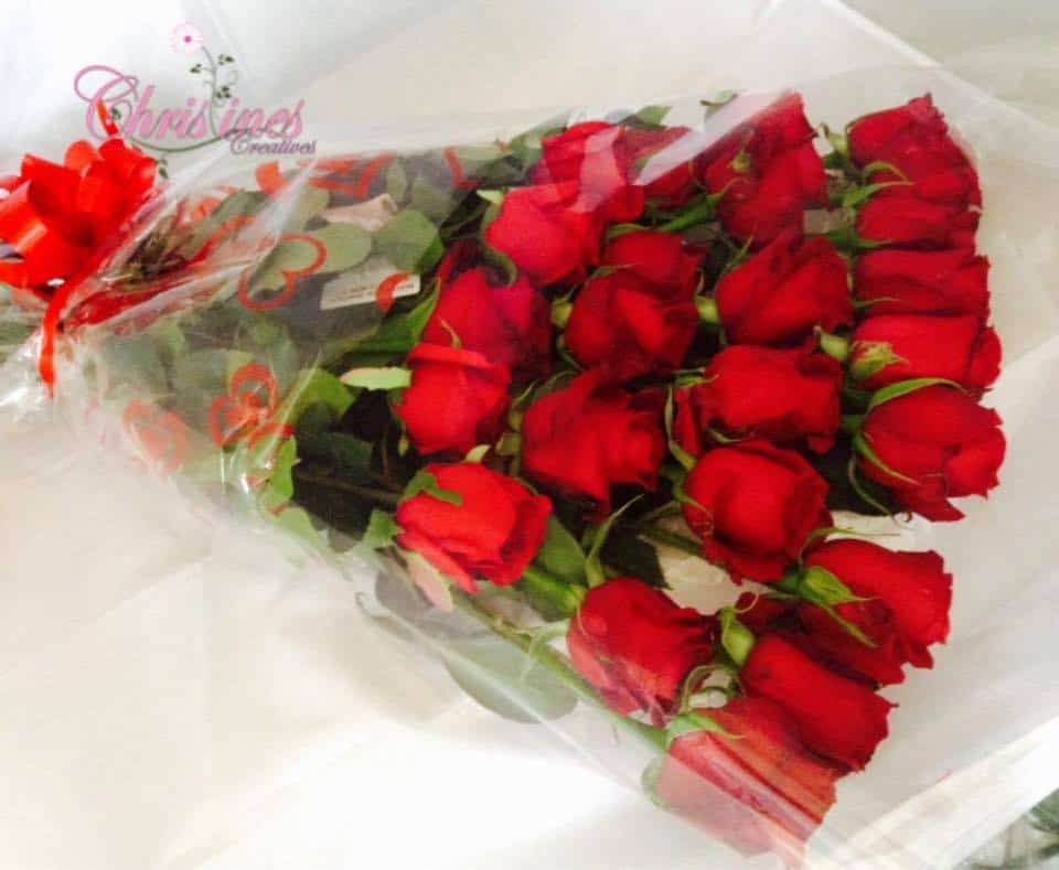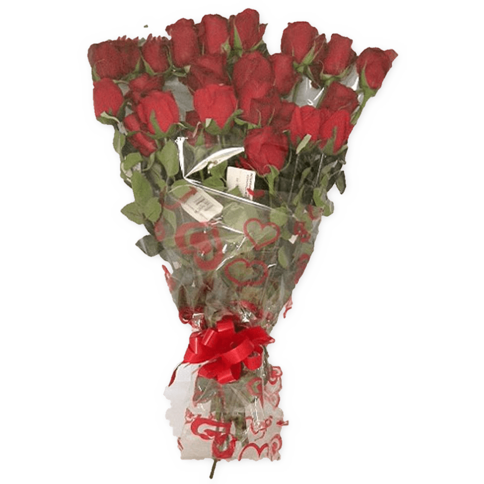 24 stunning red roses, hand tied in heart printed bouquet sleeve. Gift wrapped with a bow and message card.