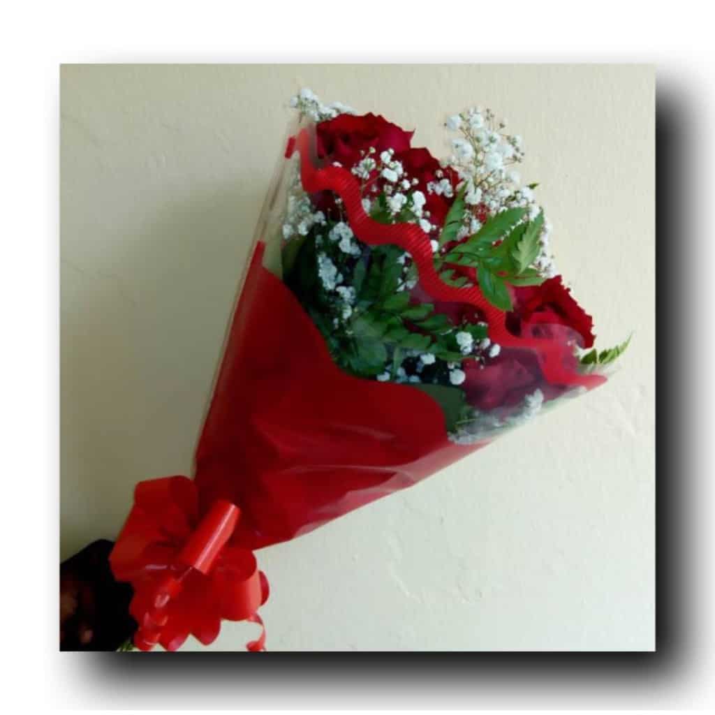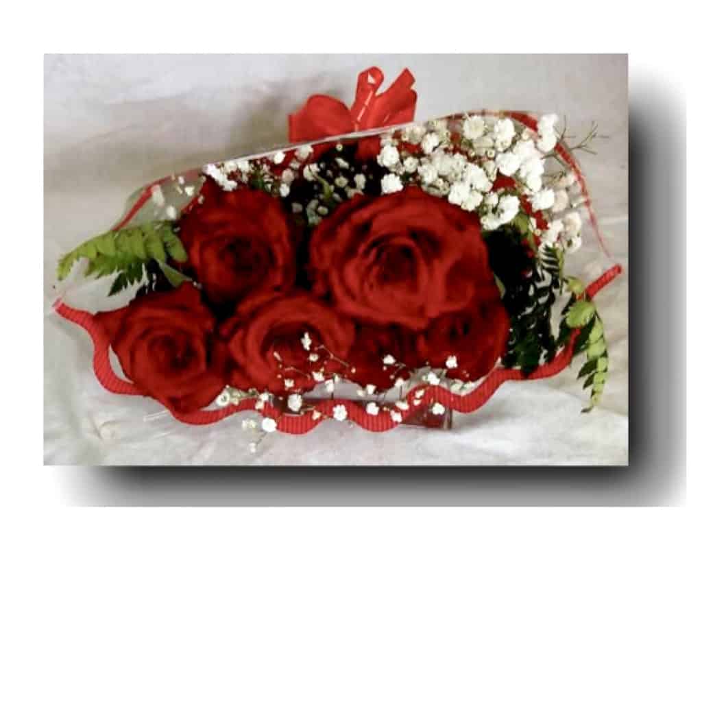 6 Roses with gypsophila wrapped in bouquet sleeve