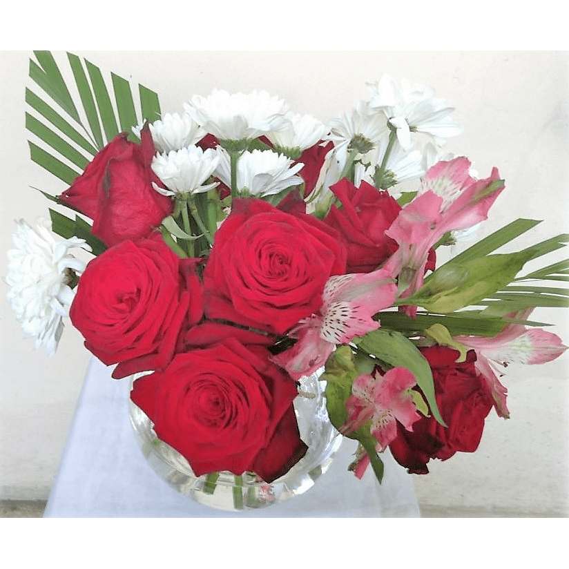 Bold red roses and dusty print alstromeria are pretty fabulous flowers to select when you want to make a statement! Golden palms gently wrap this floral arrangement, while the brilliant white chrysanthemums make it pop. The clear vase is a classy way to finish off the arrangement. This a delightful bouquet that the recipient will adore and love. Spread a little love today and order this bold and beautiful creation. You can make this even more special by adding on chocolates or a teddy. Delivery is available in Lagos.