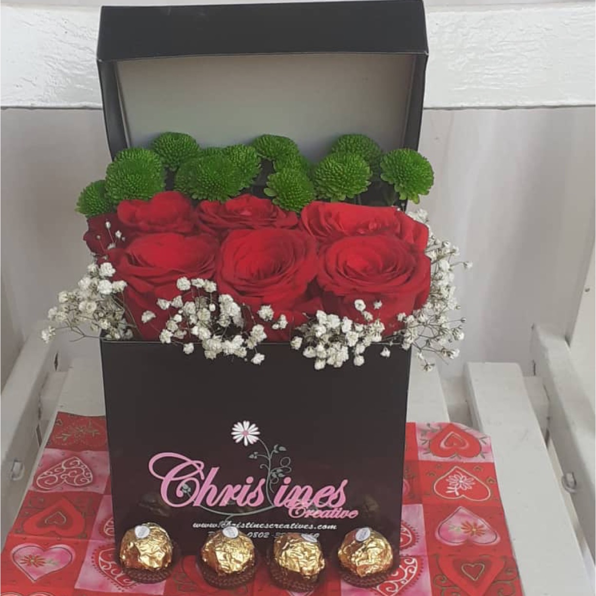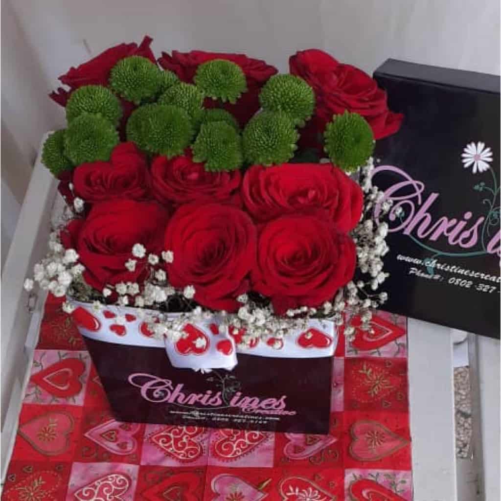 Red Roses in Bloom box with gypsophila + button green chrysanthemums + alstroemeria