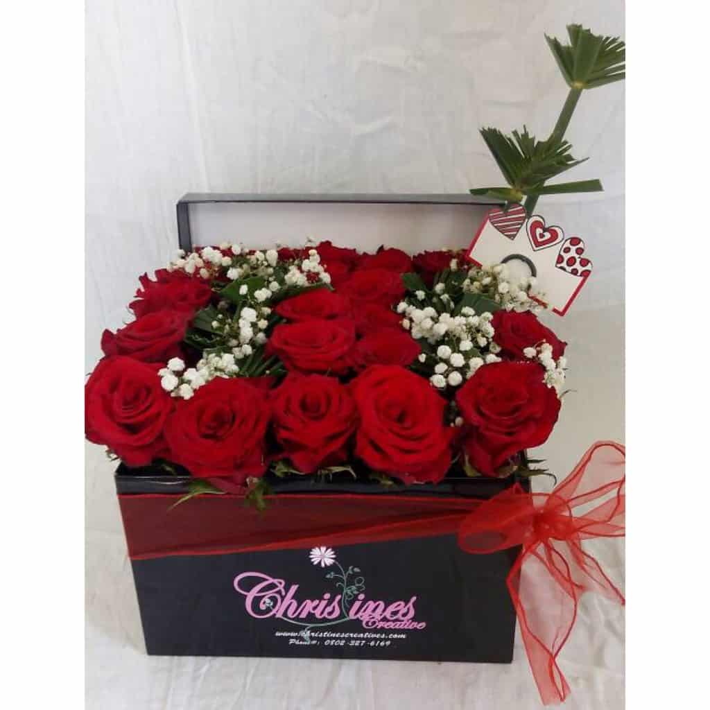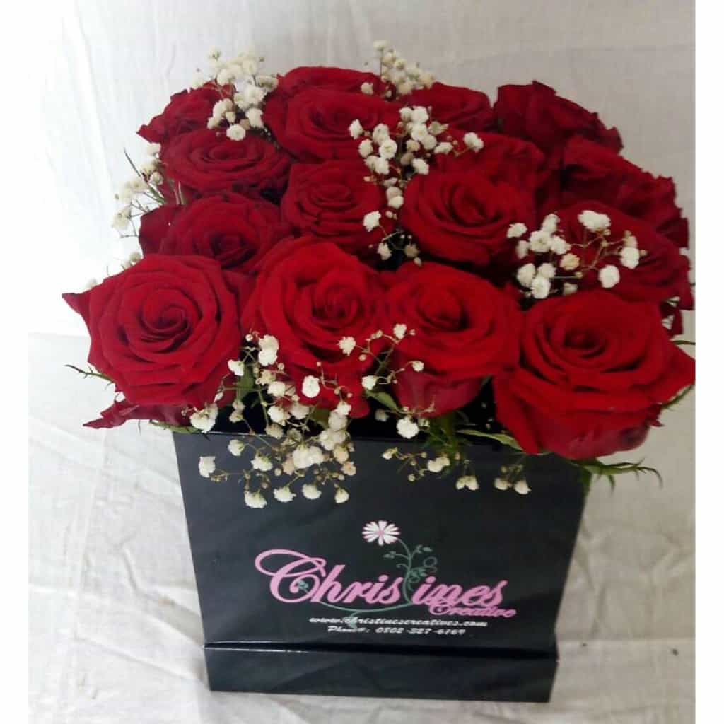 All Red Roses in Bloom Box with gypsophila and leather leaf