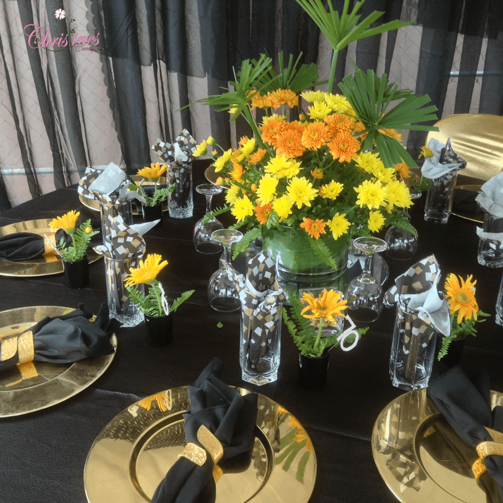 This fresh flower arrangement is a sunny splash of color that will brighten anyone’s day. Our skilled florists will design and create a floral arrangement with bright chrysanthemums, lovely cyperus leaves and ferns. The centerpiece is flanked by mini floral arrangements that help to tie this design together. This floral arrangement will make an excellent birthday gift or a floral centerpiece for a birthday party. Contact us today and let us help you navigate this beautiful world of fresh flowers.