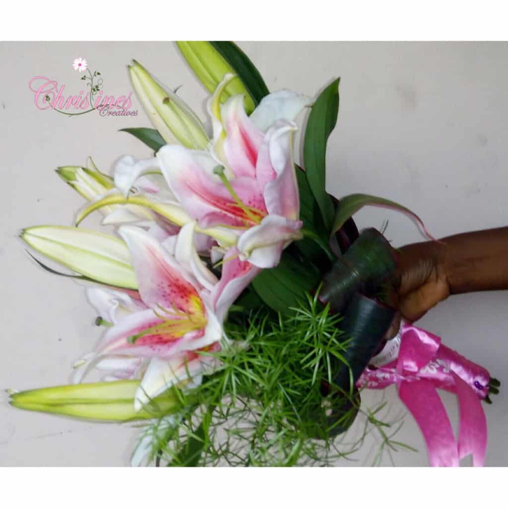 5 stems of white or pink Casablanca lilies lovingly gift wrapped with greens