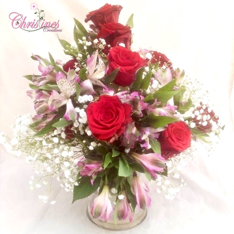 6 premium red roses with dreamy alstroemeria arranged in a clear glass flower vase
