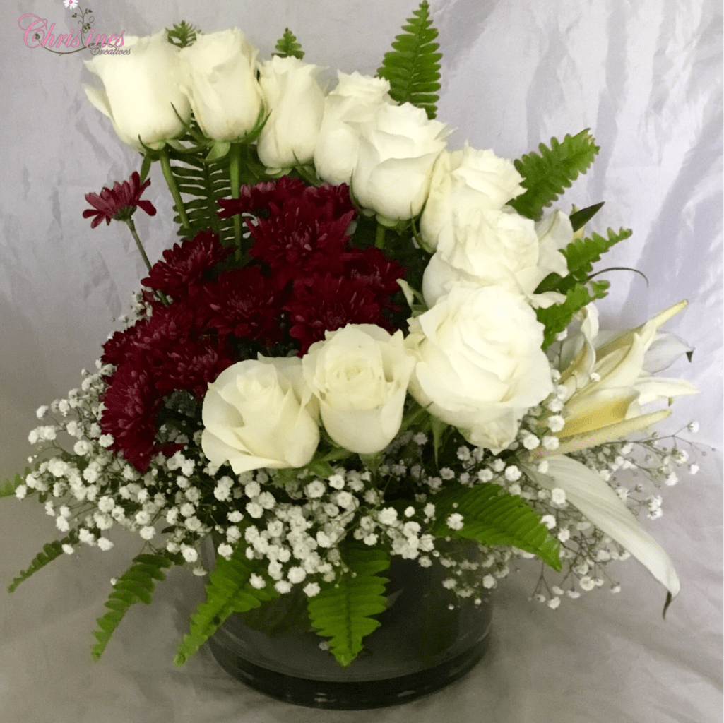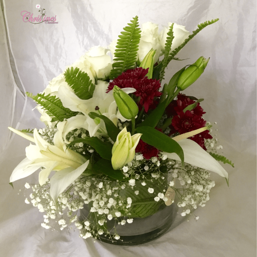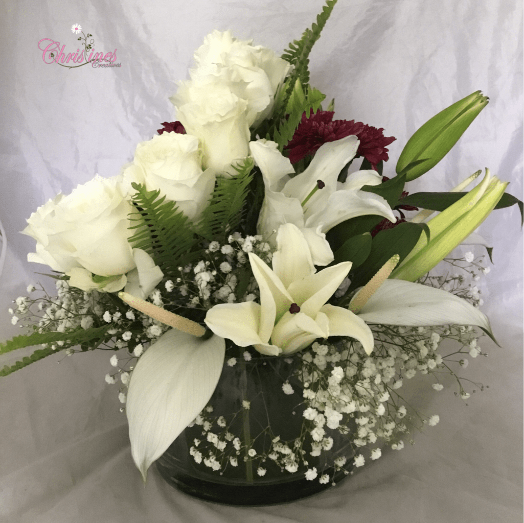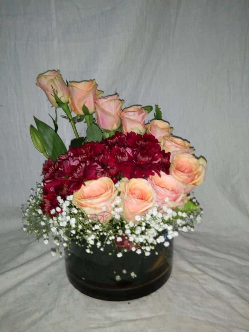 This floral arrangement has a sweet vibe that is sure to help you celebrate the special recipient! Brilliant white baby’s breath provide a perfectly lush setting for the bold colors of the roses and beautiful lilies, making this an unforgettable fresh flower arrangement. This floral bouquet is presented in a clear glass floral vase. This is a great choice to help you send your warmest wishes to friends and family. Available in White or Peach roses. Contact us if you need to order floral arrangements with roses in Lagos.