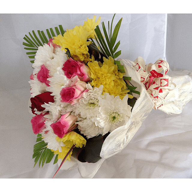 Pink and red roses with yellow and white chrysanthemums wrapped in lovely bouquet sleeve