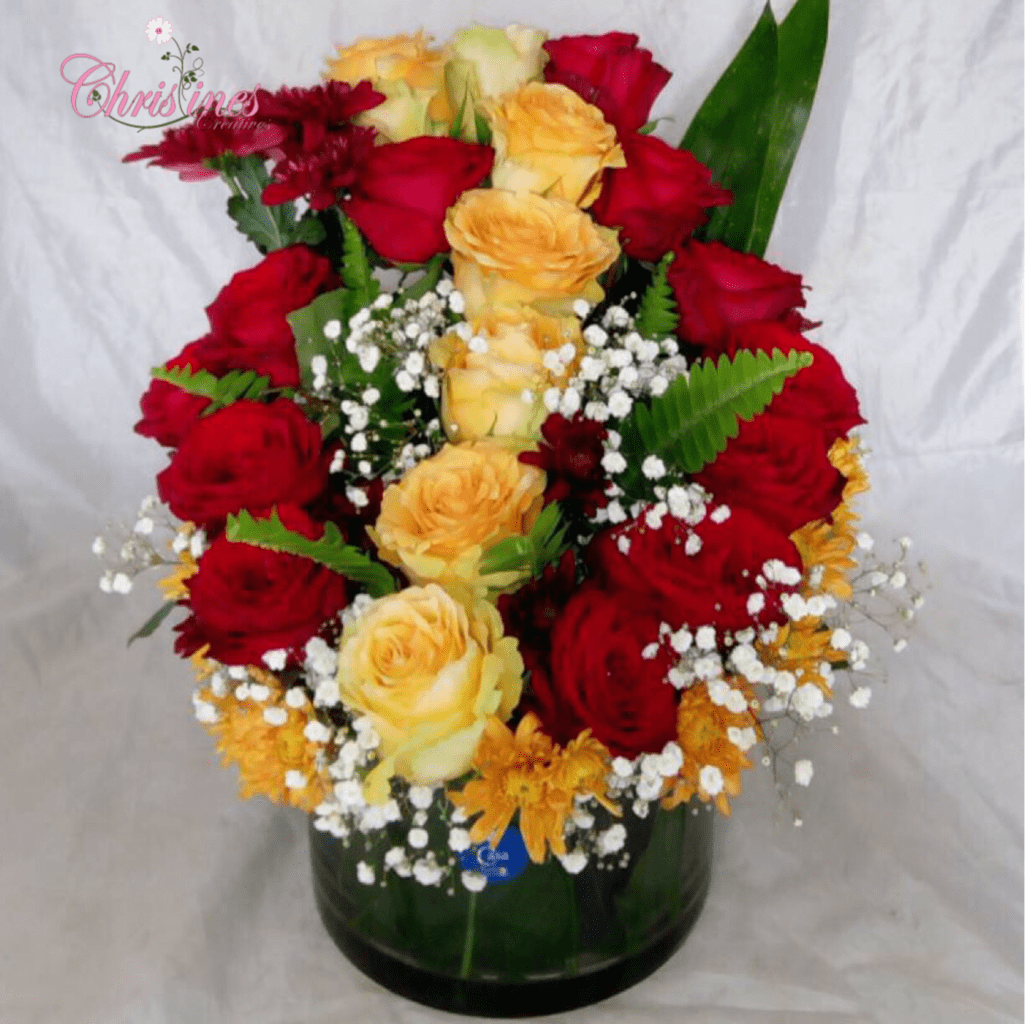 20 mixed red and colored roses with gypsophilia and chrysanthemums in circular glass vase