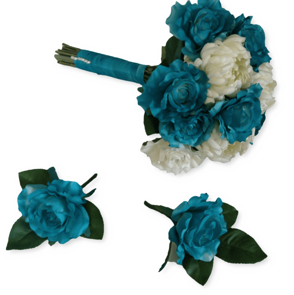 Teal roses and White pompom artificial flower bouquet